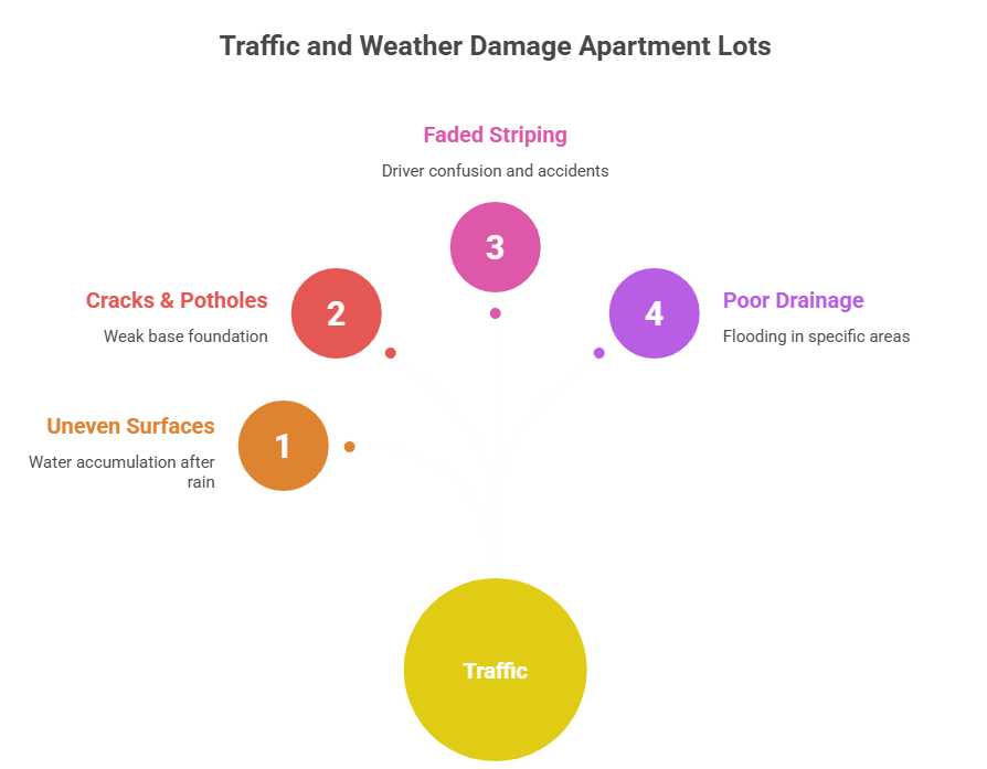 Apartment lots take more punishment than most people realize. You’ve got residents parking every day, visitors coming and going, delivery trucks, and maintenance vehicles. Over time, that traffic plus Tampa’s heat and rain can break down a poorly prepared lot pretty fast.