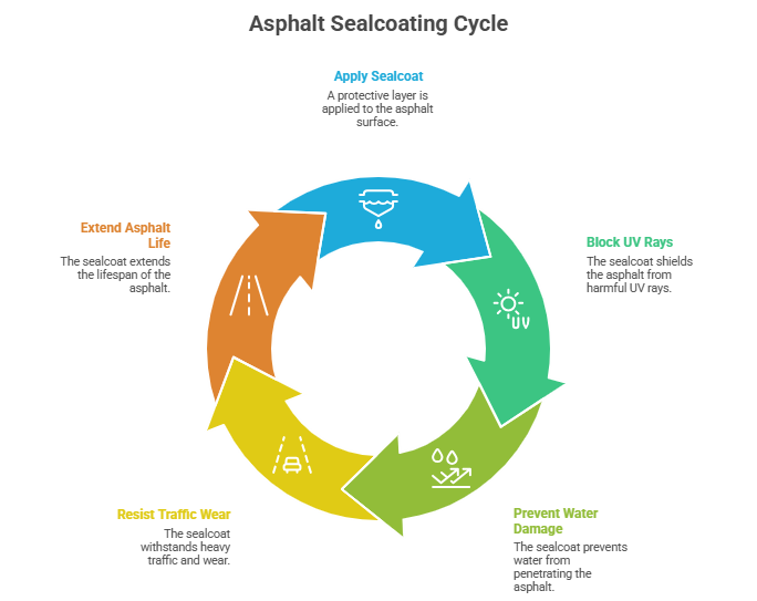 Asphalt is tough, but Tampa’s sun and rain chew it up. UV rays dry it out. Water sneaks into cracks and lifts the surface. Delivery trucks pound it daily. Commercial asphalt sealcoating puts an armor coat on top that blocks all three. The National Asphalt Pavement Association says sealcoating every 2–4 years doubles lot life. That’s not marketing — that’s math.